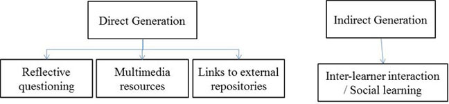 These tools have been conceptualized as "direct generation" or "indirect generation" in order to aid comprehension and classification. Direct generation tools have stimulated shared learner narratives in direct response to a resource created by the MOOC instructors. Indirect generation tools, in contrast, have generated learner narratives in response to another learner. In effect, rather than being directly influenced by the MOOC content, an additional step (i.e., another learner) has been placed in between the MOOC content and the shared narrative. This delineation between the two types of generational tools describes how it is not just the MOOC resources that are encouraging shared narratives, but also that other learners are having an impact on this behaviour. Figure 2 describes this conceptualization of personal narrative generation in MOOCs.