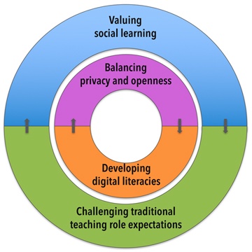 After exploring the extent to which participants used open practices and their reasons for choosing OEP or not, the analysis turned towards the third research question. What dimensions (values, practices, strategies) were shared by participants who used OEP, if any? The study of a diverse group of participants proved immensely useful here. Comparisons could be made not only among educators who used open practices, but also between those who used open practices and those who did not. Four dimensions emerged of participants who used OEP: balancing privacy and openness, developing digital literacies, valuing social learning, and challenging traditional teaching role expectations. The first two dimensions appear to be interdependent, as do the latter two. The four dimensions (see Figure 1) were shared variously by many of the participants, however all four were evident in each of the participants who used OEP. These are described briefly below and the first dimension is explored in detail in the Discussion section.