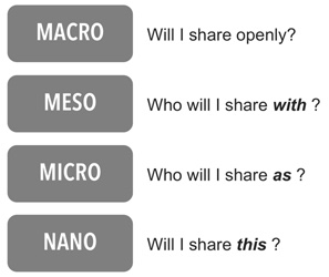 At the macro level, individuals make decisions about whether or not to engage in open sharing and networking. Some opt out at this level, while those who engage in open practice must consider questions at three further levels. At the meso level, individuals consider whom they would like share with (e.g., family, friends, colleagues, students, community/interest groups, the wider public) as well as those with whom they do not want to share. At the micro level, individuals make decisions about their digital identities, i.e. who they will share as. And at the nano level, individuals decide whether to interact/share something particular: for example, post, tweet, or retweet; use a specific tag or hashtag; like, follow, or friend.