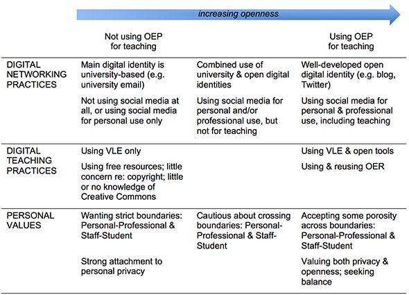 Participants described a wide range of digital and pedagogical practices and values; a summary of these is shown in Table 3. It is impossible to draw a clear boundary between educators who do and do not use OEP. Instead there is a continuum of practices and values ranging from "closed" to open. A complex picture emerges of a broad range of educators: some open (in one or more ways), some not; some moving towards openness (in one or more ways), some not; but all thinking deeply about their digital and pedagogical decisions. This concurs with other research findings that configurations of openness are uneven and diverse on both organizational (Ehlers, 2011) and individual (Veletsianos, 2015) levels. Overall, for the participants in this study, "using OEP" was primarily characterized by: having a well-developed open digital identity; using social media for personal and professional use, including teaching; using both a VLE and open tools; using and reusing OER; valuing both privacy and openness; and accepting some porosity across personal-professional and staff-student boundaries.