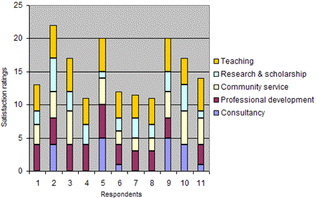 Figure 3. Academic staff job satisfaction ratings in each of the five broad areas of responsibility, Faculty or Rural Management, The University of Sydney, 2002.
