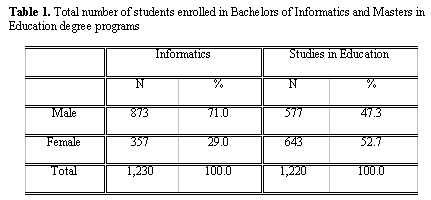 Students have the option of choosing any of the aforementioned module combinations, so long as they do not exceed the module limit per academic year. Table 1 below illustrates the total number of students enrolled in both the Bachelors of Informatics and the Masters of Education degree programs. Please note the low percentage of female students enrolled in the Informatics courses.