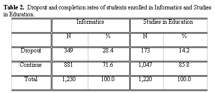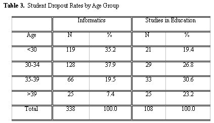 For comparison between the Informatics course and the Studies in Education course, in the Informatics course there are twice as many dropouts in the overall number of students enrolled, twice as many dropouts age 30 or younger, and twice as many dropouts whose profession/ employment situation is not related to informatics, as compared to the analogous percentages calculated for Studies in Education.