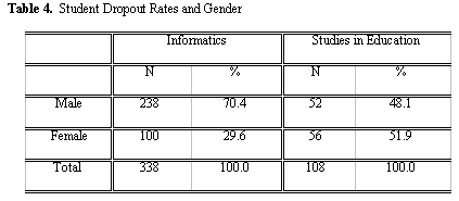 Table 4 shows the distribution of student dropout rates by gender. For “Studies in Education,” females consist of 52.7 percent of the sample, and the 51.9 percent of the dropouts (x2=0.8, DF=1, NS). Similar results were found for “Informatics” students, in which females consist of the 29.0 percent of the sample, and the 29.69 percent of the dropouts (x2=0.4, DF=1, NS). Considering that differences for both programs of studies are not statistically significant, the correlation between dropouts and gender shows that the overall dropout rates are similar in men and women.