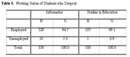 Table 5 shows that all students who had dropped out – with the exception of one – were presently employed at the time of this study. Only one student (female) stated that she was unemployed. Bearing in mind that the percentage of unemployed students within the total number of students attending the “Studies in Education” course is 2.1 percent, we concluded that the dropout rates are similar (not statistically significant) in employed and unemployed students.