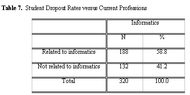 Table 7 illustrates the correlation between dropouts and students’ working involvement in professional activities related to Informatics. The high percentage (41.2 percent) of dropout students whose professional activity/ work was not related to Informatics indicates the statistically significant correlation between student dropouts and involvement of students in activities directly or indirectly related to Informatics (R=0.428, p<0.0001). Obviously a profession indirectly or directly related to Informatics (e.g., being an avid computer user, programmer, or technician) provides these students with a significant amount of tacit background knowledge, which typically augments their learning. Furthermore, they can put their academic knowledge into action in their daily working life (e.g., interacting on a professional level with their work colleagues and peers).
