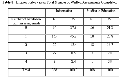 The Informatics course yields similar results, as shown in Table 8, which shows that 73.6 percent of the students who had elected to dropout had only handed-in none or only one written assignment.