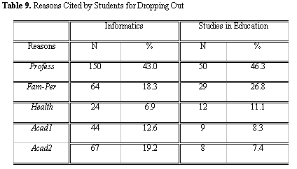 There were similarities concerning the numbers of students who elected to drop out because of family, personal, or health reasons. Such reasons, relate to childbirth, child rearing, marriage, pregnancy, travel problems, decease of a family member, and other personal reasons (some of which the students were not willing to discuss) or reasons related to personal or familial health problems.