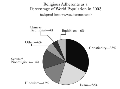 In Figure 1, the majority of people on earth ascribe to some religion. The world's largest faiths are really conglomerations of smaller sects or denominations, which makes it difficult to deliver many specific statements which would hold true for the entire religion, especially about orientations to new technological innovations and opportunities afforded by distance education. For example, between China and Southeast Asia even the canon of Buddhist religious texts only overlap by approximately 10 percent (Dr. Lewis Lancaster, Personal Communication, March 16, 2004), so making any kind of definitive statements about the orientation of all Buddhists toward something like distance education is virtually impossible.