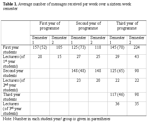 Teaching in a class requires lecturers to take sections of 30 - 35 students, and in most instances students see themselves as being in a “whole class” of that size. A few lecturers teaching more than one section combine their sections to form a whole class of 60 - 70 students. Lecturers lead or facilitate discussion in the whole class forums in contrast with the small groups discussions that are collaborative (Bonk and Cunningham, 1998; Bruffee, 1999), student led and have minimal lecturer involvement. Teaching throughout the programme follows a broadly constructivist approach (Jonassen, Davidson, Collins, and Bannan Haag, 1995).