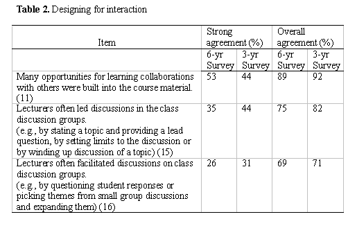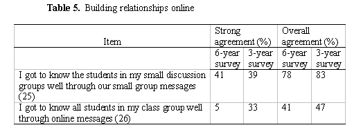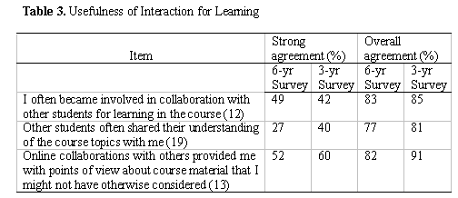The figures in Table 3 show a high level of overall agreement about the existence of collaboration in the course. Of most importance is the response to the third of these items, showing that a majority of students are in strong agreement that, through collaboration with others, they were exposed to new points of view about the concepts and ideas expressed in course material. For the second item, the low level of strong agreement in the six-year survey can be teased out through consideration of the different responses of students in each year group. Students in their first year of study had a low level of strong agreement with this item (21 percent), while 34 percent of students in their third year of study report strong agreement. It is not surprising to find that as students become more accustom to working with each other, they become more willing to share ideas and understandings.