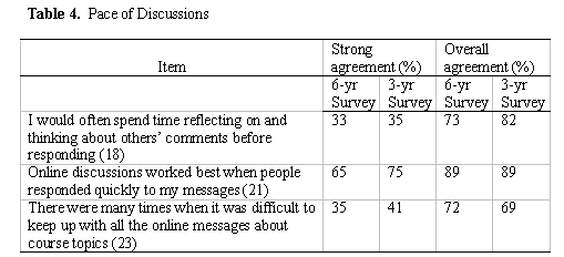 Table 4 points to a tension in the use of asynchronous online communication. The programme requirement of reflective comment was a good match with the affordances of asynchronous communication. Asynchronous communication, however, also means that the number of messages to be viewed by students, builds up while they are offline, making message reading a lengthy task. In addition, the paced nature of the discussion requires some commitment to timeliness in communication. The tension that exists between reflection and the pace of discussion is also seen in the comments that students make. The discussion provided a “valuable opportunity” (18, 18) and reflection on others comments was a case of: “You need to think about things before opening your trap!” (108, 18). However, time constraints were clearly signalled, as in: “Often too busy with assignments, and if lots of messages not enough time” (55, 18). One student reported “The discussion groups worked well to get to know people however it is difficult to discuss complex issues due to the fact we all organise our work at different times during the week and replies are slow” (33, 42), a statement that reflects both the value and the difficulties of a course reliant on asynchronous online communication.