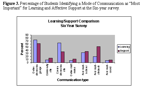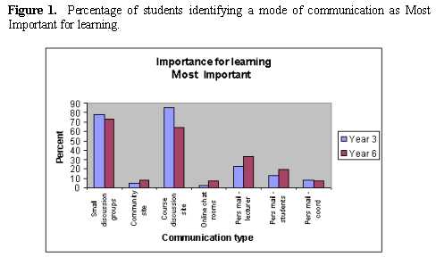 Figure 1 clearly shows that it is exchanges between groups of people, rather than individual exchanges, that students see as being of most importance in their learning. The importance of small groups as sites for learning has stayed remarkably constant across the surveys. The importance of the whole class course discussion site diminished from the third to the sixth year survey. This whole class area is the major site of lecturer involvement in discussion. The decline in importance of this whole class area possibly reflects the decrease in lecturer online presence perceived by students and reported in Table 2.