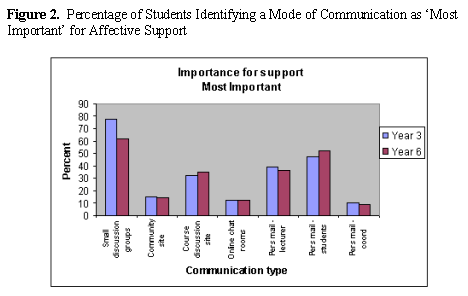 This section presents and discusses survey results relating to student perceptions of the manner in which affective support was part of their online interaction. We have previously discussed the importance of creating feelings of connectedness amongst students at a distance, and developing a culture of support and care. The data we present shows the importance of the small groups in making that support available.