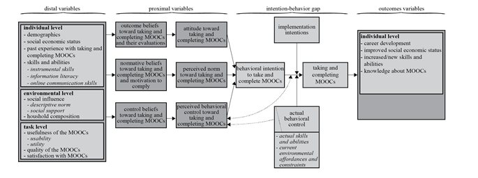 To be able to analyse the intention-behavior gap more thoroughly we have integrated work by Gollwitzer about implementation intentions (Gollwitzer & Oettingen, 2013). Implementation intentions are concrete plans for how a specific goal can be achieved. This aspect is important, because the huge gap between numbers of participants that sign up for a MOOC and the numbers who actually start learning activities can point to a MOOC’s low perceived value or lack of implementation intentions among potential participants. These three theoretical foundations are combined with other aspects like usability aspect or interaction experiences in MOOCs taken.
