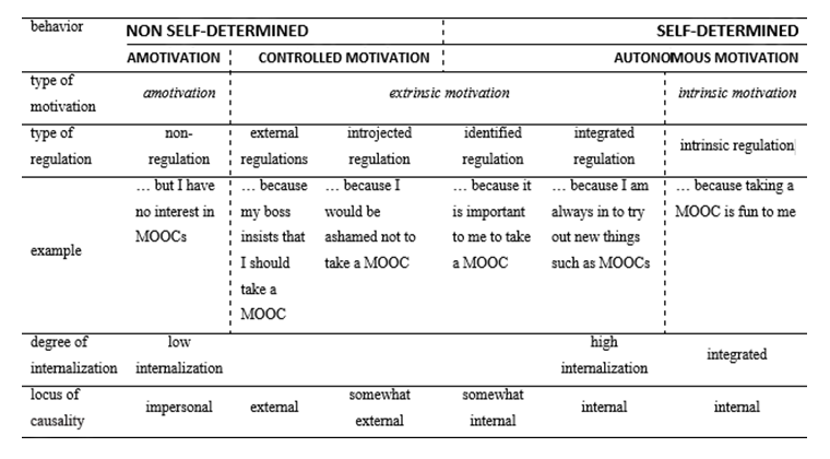 Self-determination theory (SDT) differentiates between intrinsic and extrinsic motivation and assumes that people have three basic needs namely: competence, relatedness, and autonomy. Autonomy is the feeling that people have when they are originators of their own actions (in harmony with the concept of the integrated self). Competence is the feeling people have when they are effective, and that there are sufficient opportunities to demonstrate efficacy. Relatedness is the feeling people have when they are connected and valued by others and that they experience a sense of belonging. If the social environment does not satisfy these basic psychological needs, then negative consequences will follow with respect to activity and development. However, the degree to which each of these needs are promoted and satisfied determine the types of motivations and the consequent regulations that are developed. These types may be categorized as self-determined versus controlled (i.e., non- self-determined) or as autonomous motivation versus controlled motivation. The Perceived Locus of Causality (PLOC) (Ryan & Connel, 1989) represent all the SDT motivational types ordered in from the most undesirable form of non-self-determined behavior (amotivation) to the most desired form of self-determined behavior (intrinsic motivation). Figure 2 depicts these types of motivations.
