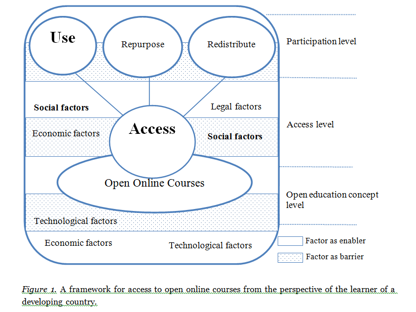 This section develops a conceptual representation of the relationship among the open education concept; access to open online courses; barriers to, or enablers of, access; and universal design of online learning. The paper shows, with reference to access and use of open online courses by learners of developing countries, that the factors follow a three-level relationship. The open education concept is at one level as the root, which all OER initiatives should draw from and be founded on; this level is referred to as the open education concept level. Also, primarily, open education aims at making education universally available (Caswell et al., 2008), which cannot be made possible without ensuring access to OER offerings (Huijser, Bedford, & Bull, 2008). Access to open online courses, is therefore at a first level as the central concept, a level called the access level. A second, referred to as the participation level, caters for the use, modification or repurposing, and redistribution of open online courses. Social and other factors contribute as either barriers or enablers to access at all levels of the relationship.