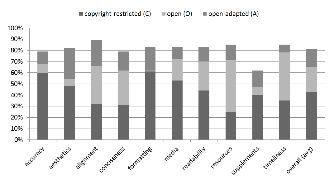 Overall, the open textbooks were rated 22% higher than the copyright-restricted textbooks, the open/adapted textbooks were rated 16% higher than the open textbooks, and the open/adapted textbooks were rated 38% higher than the copyright-restricted textbooks (cf. Table 1).