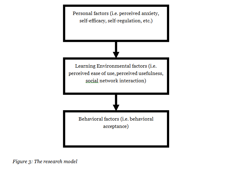 Furthermore, progressively understanding gender difference toward m-learning is the major research objective of this study. As stated before, the previous studies (Albert & Johnson, 2011; Chu, 2010; Liaw, 2002; Liaw, 2007; Ong & Lai, 2006) are not conclusive with respect to the level of positive attitudes toward information technology and gender. Therefore, based on our research model as shown in Figure 3, we will propose our research hypotheses based on personal factors (such as perceived self-efficacy, anxiety, and self-regulation) will affect learning environmental factors (such as perceived ease of use, perceived usefulness, social network interaction); additionally, learning environmental factors will positively influence behavioral factor (such as behavioral acceptance).