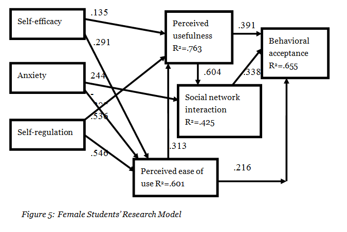 After investigating our 15 hypotheses as presented in Figure 4, we may conclude that gender influences attitudes towards m-learning acceptance. Perceived anxiety is a positive significant predictor for social network interaction for female learners while perceived self-efficacy and perceived self-regulation have more positive contribution for male learners. Perceived usefulness has the highest contribution on behavioral acceptance toward m-learning for both female and male learners. These results are aligned with previous studies (Carr, 2005; Okazaki & Renda dos Santos, 2012; Ong & Lai, 2006) claiming that female and male learners have different cause relationship among attitudes toward m-learning.