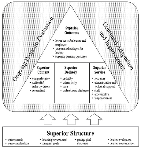 Quality has been defined in terms of the design of the e-Learning experience, the contextualized experience of learners, and evidence of learning outcomes (Carr and Carr, 2000; Jung 2000; Salmon, 2000). Quality and design of e-Learning courses, however, are sometimes compromised in an “ . . . effort to simply get something up and running” in response to pressing consumer demands (Dick, 1996, p. 59). Educators and researchers have voiced concern over the lack of rigorous evaluation studies of e-Learning programs (e.g., Arbaugh, 2000; Howell, Saba, Lindsay, and Williams, 2004; Lockyer, Patterson, and Harper, 1999; Robinson, 2001). McGorry (2003) adds, “although the number of courses being delivered via the Internet is increasing rapidly, our knowledge of what makes these courses effective learning experiences is limited” (p. 160). In an economic environment marked by intensive competition between educational institutions, producing and ensuring quality e-Learning programs will be a competitive advantage to attract learners to post secondary institutions (Daniel, 1996; Duderstadt, 1999).