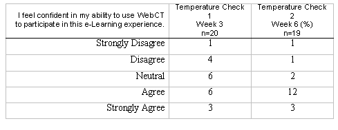 Three weeks into the course, much of the stress over the technology and consequently the stress in the class appeared to subside. Interestingly, learning to use PowerPoint to create a conceptual framework, as well as basic word processing skills, seemed to create more obstacles than using WebCT. For some, this challenge eclipsed all others. By week 6, midway through the course, there was a positive shift in the learners’ confidence and ability to use WebCT (see Table 1). Now 15 participants compared to 9 three weeks earlier, were feeling comfortable with the online environment.