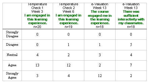 To help learners orient themselves to the e-Learning environment we created E-Venture, a series of activities learners completed in the first week to familiarize themselves with WebCT. One of these activities was to create and post an e-Page, which included a short introduction and image (optional). We also tried to anticipate challenges learners might face in writing the research paper. This led to the design of tools such as the online American Psychological Association (APA) self-assessment to help learners figure out the nuances of academic referencing. Strategically placed at three-week intervals, three temperature checks gave learners an opportunity to provide learner feedback, enabling us to respond to learner needs as the course progressed. Toll free technical support for password, connectivity, and hardware problems was provided by the University help desk, although it was not a 24 x 7 support service.