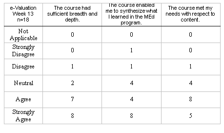 The content-related theme emerging from the data is the social construction of the course content. Most course content was constructed by learners as they crafted their paper, exchanged feedback with triad members and the e-moderator, and shared ideas in the online discussion groups. Learners seemed to value the flexible nature of the content, as this comment illustrates: “It was a strength of the course that all of the course content was either directly related to writing the synthesis paper or our personal e-Learning. No time was wasted on irrelevant examples” (e-V). According to the e-Valuation, the content seemed to meet most learners’ needs, have sufficient breadth and depth, and enabled learners to synthesize what they had learned throughout the MEd program (see Table 3).