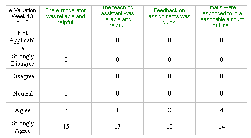 The course design included an optional three-hour long F2F orientation session in the first week, designed to help ease learners into their first e-Learning experience and ensure a successful online experience. While the intent was to enable learners to participate online at anytime and from anyplace, in order to facilitate community and orient them to WebCT, this F2F session became a course design element. In this respect, offering one of the thirteen classes F2F reflects a blended approach. It is possible, however, for learners to successfully participate in the online course without attending this F2F session.