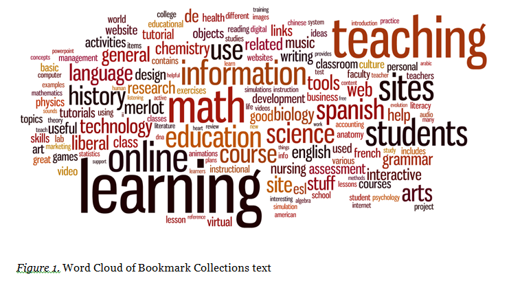 Analysis of Bookmark Collection content, using keywords, was conducted as well. Observation of words used in the Bookmark Collections can be visualized using “words cloud”, as shown in Figure 1 (the number of word instances is reflected in the font size of each word). The cloud shows topics related to teaching and learning, assessment, information, technology, etc. in various disciplines, such as science, chemistry, biology, language, history, arts, and music.