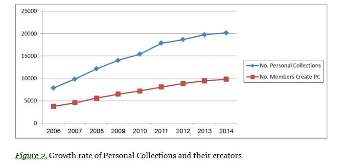 The collection number grows over time as well as the number of members creating them (Figure 2). During the past eight years, the number of collections increased from 7,837 to 20,138, and the number of collection creators increased, as well, from 4,330 to 9,802.
