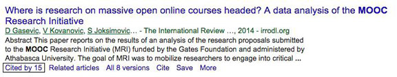 Gasevic, D., Kovanovic, V., Joksimovic, S., & Siemens, G. (2014). Where is research on massive open online courses headed? A data analysis of the MOOC Research Initiative. The International Review of Research in Open and Distributed Learning, 15 (5). Retrieved from http://www.irrodl.org/index.php/irrodl/article/view/1954