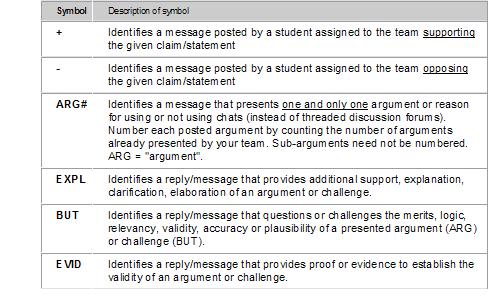 Students also identified each message by team membership by adding an “-” for opposing or a “+” for supporting team to the message labels (e.g., +ARG, -ARG). These tags enabled students to easily locate exchanges between members from opposing teams (e.g., +ARG –› -BUT) and respond to the exchanges to advance their team’s position. An example is illustrated in Figure 2.