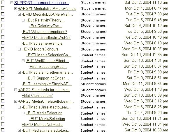 Computer software was written by the investigator to download and compile messages from Blackboard discussion forums into Microsoft Excel. The codes assigned to each message by the students were automatically pulled from the subject headings to identify each message an argument (ARG), evidence (EVID), challenge (BUT), or explanation (EXPL). The seven most commonly used qualifiers (“but”, “if”, “may/ might”, “I think”, “often”, “probably”, and “though”) identified by Fahy (2002b) were used to assign messages to the qualifiers group. The five most commonly used intensifiers (“very”, “only”, “every”, “never”, and “always”) were used to assign messages to the intensifiers group.