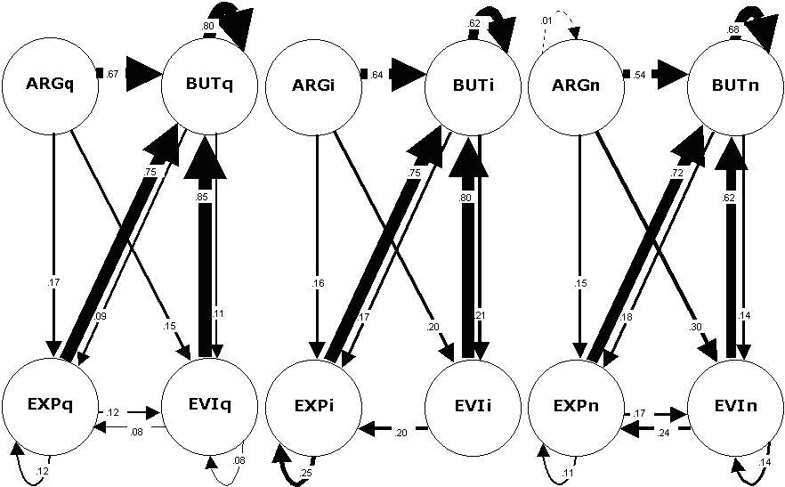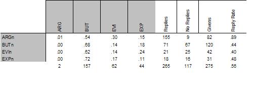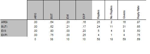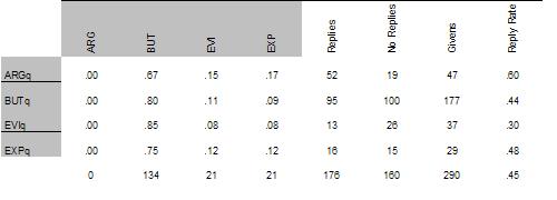 Note: ARG = argument, BUT = challenge, EVI = supporting or counter evidence, EXP = explanation. For example, the top matrix shows that 67 percent of the 52 replies to ARGq were challenges (BUT). In contrast, the third matrix shows that 54 percent of the 155 replies to ARGn were challenges.