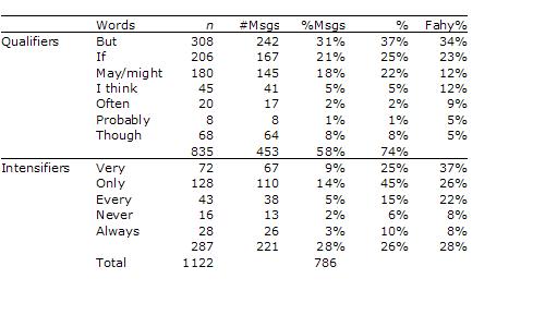 Table 1. Frequency of qualifiers and intensifiers observed in study