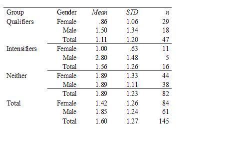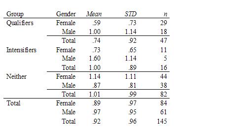Note: Females used 43 percent more qualifiers per message (M = 1.21, STD = 1.49, n = 470) than males (M = .84, STD = 1.04, n = 312). Females used 22 percent more intensifiers per message (M = .39, STD = .68, n = 469) than males (M = .32, STD = .62, n = 312).