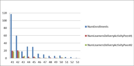 Figure 3. Number of learners who enrolled each week alongside the number of learners who delivered the peer-reviewed activities (compulsory).