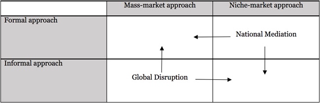 Even if there have been several efforts to categorize MOOCs in various ways, we suggest that our typology, as described and illustrated in Table 1, contributes a useful overview of the diversity of MOOCs that goes beyond the overall discussion of what xMOOCs and cMOOCs and their various motivations are (Liyanagunawardena, Adams, & Williams, 2013; Ross, Sinclair, Knox, Bayne, & Macleod, 2014). The table is useful both to describe the Norwegian development path and to distinguish between the national mediation and the global disruption approach. The national mediation approach can be associated with the formal, niche-market types of MOOCs, since they target narrow groups of students in terms of geography and try to provide formal recognition within one or a few countries. The global disruption approach, on the other hand, can be associated with informal, mass-market types of MOOCs, since they target a broad group of students in terms of geography and do not attempt to provide any national accreditation of the courses.