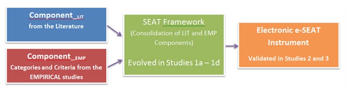 SEAT was initially constructed by creating Component-LIT from literature and Component-EMP from empirical studies among MCQ users. The two were merged in the SEAT Framework (Figure 1), which evolved over four studies, 1a-1d, before being converted to the e-SEAT Instrument, which was validated and refined in Studies 2 and 3.