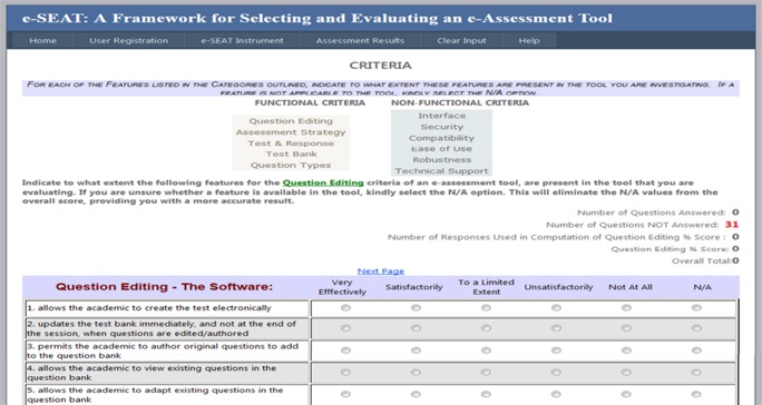 This version served as the basis for the e-SEAT Instrument. A computer programmer took the categories and criteria of the SEAT Framework and constructed an interactive electronic evaluation instrument to analyse users' input on MCQ systems/tools and to provide automated scoring for each criterion, calculations, and reports. e-SEAT generates category ratings and an overall rating. In Studies 2 and 3, selected participants evaluated, applied, and validated e-SEAT. Their feedback was used to correct problems in the automated version, and to refine terminology, but no further changes were made to the criteria.