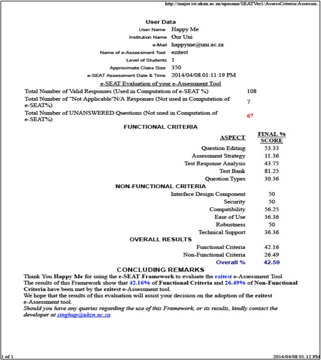 After a user has evaluated an MCQ tool, e-SEAT generates a report. It appears onscreen and is also e-mailed to the user and the researcher-designer. Figure 6 shows a report regarding a fictitious system called Ezitest.
