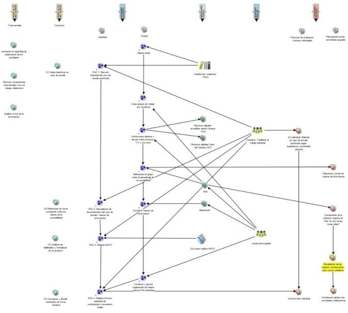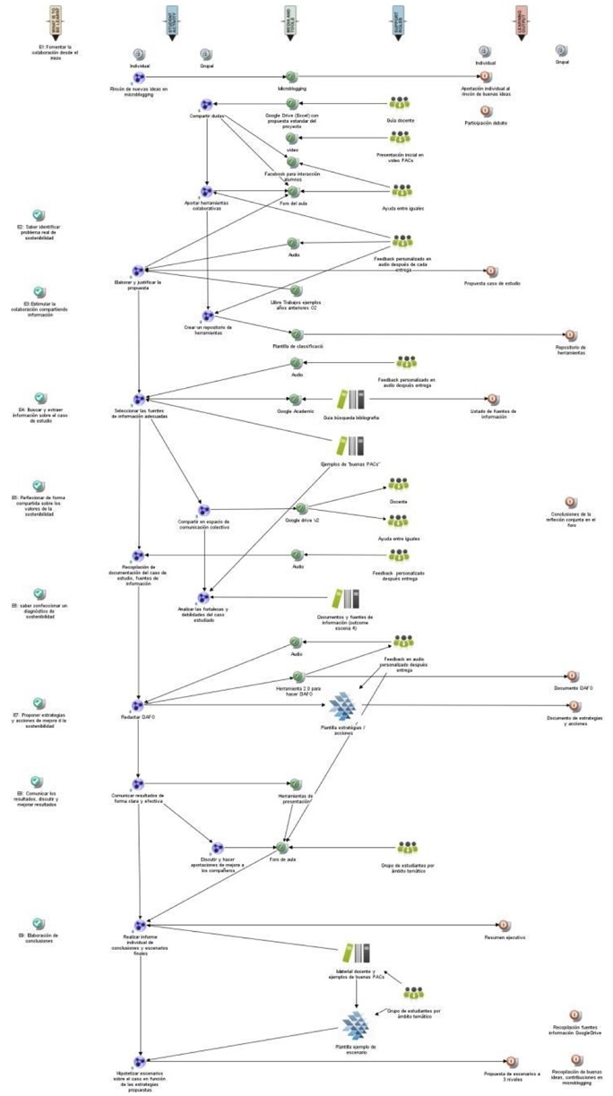 In V1 the teacher indicated that he wanted to reduce the percentage of students dropping out of the course. To do this, he proposed various strategies, including increasing peer support and the students' capacity for collaboration, reinforcing their competencies in this area, as well as their ability to perform a critical analysis of the information. The teacher set three cross-cutting general objectives, and a further four more specific objectives directly linked to each of the four learning activities structuring the students' work. In V2 the teacher restructured the cross-cutting and specific objectives and connected them to nine activity scenes in a much more specific way that focused on developing competencies. This new focus yielded activity transitions that were much more interlinked in the design, clarifying the continuity for the teacher as well as for the students. This in turn enabled, for example, the collaborative competency to be reflected in the activity sequence rather than just mentioned in a cross-cutting objective, which did not specifically materialise in V1. In V3, no changes relating to the learning objectives were included.