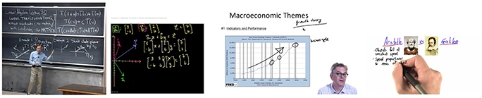Figure 1. The presentation format of instructional videos ranges from direct recording of classroom teaching with a stationary camera, or writing board screencasts with voice-over, to highly elaborate video post-production with picture-in-picture, or video blending techniques (from left to right: MIT OpenCourseware, Khan Academy, Coursera, Udacity)