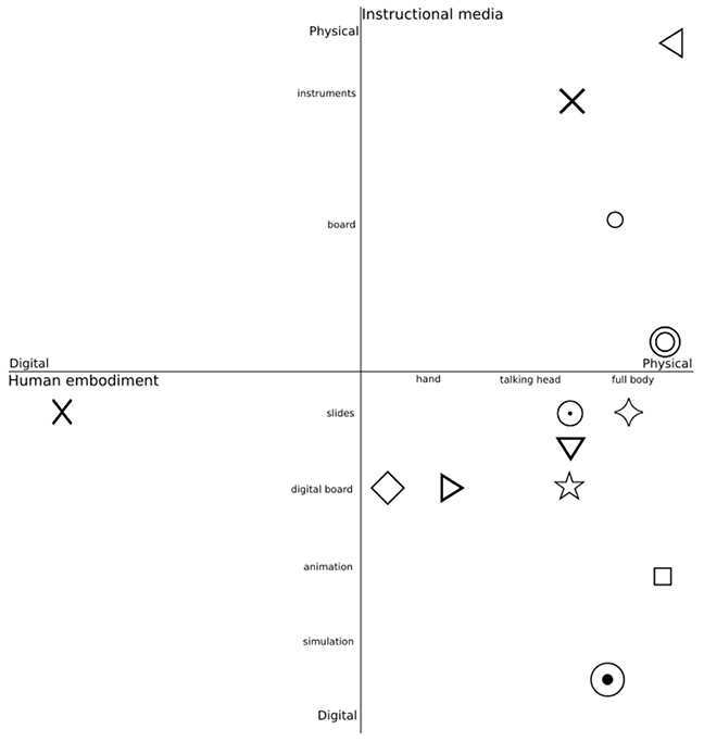 In summary (Figure 2), instructional video formats can be organized into two dimensions: human embodiment and instructional media, which have several nominal values from digital (or artificial) to physical. Although the proposed taxonomy of instructional video styles is just a snapshot of the current situation, the focus of the taxonomy is on the classification factors (human embodiment, instructional media), rather than the details of the production style. Therefore, the discussion that follows is based on those factors. The level of human embodiment varies widely between video lecture formats from wide shots that include the audience heads to screen capturing of the tip of the pen. The type of instructional media is another classification factor that varies from slides and animations, to objects manipulated by the instructor. The proposed taxonomy should be useful in understanding the landscape of available options when planning to create a familiar instructional video, or when designing a novel format.