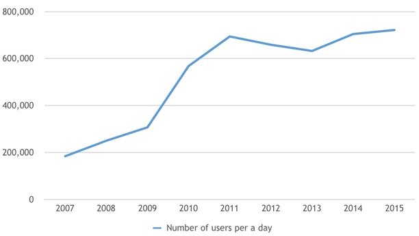 In the K-12 education phase, many countries have implemented open courseware (OCW) type approaches to address the problems of a conventional education curriculum (Butcher & Wilson-Strydom, 2008). Such approaches were meaningful in that students could access additional learning opportunities outside of the formal education system. At the same time, there was a limitation in the fact that the status of mainstream education would remain unchanged. In contrast, the South Korean central government launched the EBS K-12 e-learning programs so students could practice OER within the mainstream education curriculum. For instance, on the subject of 12th grade Korean language arts, EBS published 44 coursebooks in 2015, 34 coursebooks in 2014, 31 coursebooks in 2013, and 23 coursebooks in 2012. For the students, the EBS also provides video lectures (both streaming and download) for every single coursebook, online forums for discussions, and question-and-answer bulletins. For the Korean language arts teachers, the EBS provides a teacher edition of each coursebook, with extra notes. With these efforts, over the last decade, the average number of users per a day is 524,400 (Ministry of Education South Korea, 2016). Figure 1 reveals that there has been a steady increase in the number of users of EBS resources since 2007.