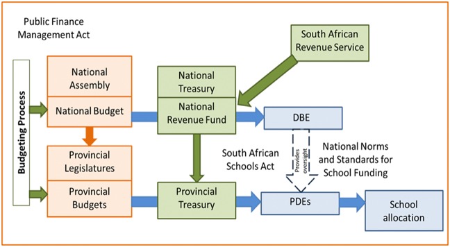 Figure 1. Simplified schematic of the national budgeting and allocation process for basic education. Orange boxes indicate national and provincial government budgeting, green boxes indicate Treasury allocation, while blue boxes indicate DBE, PDE, and schools.