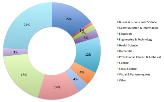 Sixty-four percent of the sample identified as female, 52% reported that English is their second or subsequent language, and 35% identified as a visible minority. The median respondent was a first-year undergraduate student enrolled in three courses (the threshold for categorization as a full-time student), had enrolled in seven to nine courses over the previous 12 months (including the current semester), and had an average grade (across all of their undergraduate coursework) of 70-80%. The sample represents a broad range of disciplines (see Figure 1). Most (81%) respondents had never taken a course that was taught entirely or partly online. Only 31% of respondents were not currently employed, with 44% working more than 15 hours per week. Furthermore, 72% of those that were employed reported earning less than $500 per week. Twenty-four percent of participants reported holding a student loan.