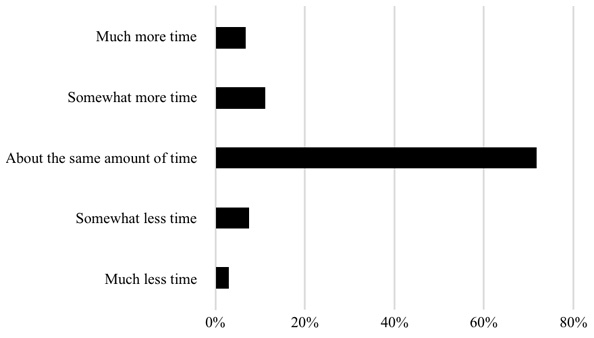 Teacher preparation time. Of the faculty members in our study, 82% stated that they spent about the same or less time preparing to teach a course using open textbooks, while 18% said that they spent more time. Figure 4 shows the percentage of faculty preparation time.