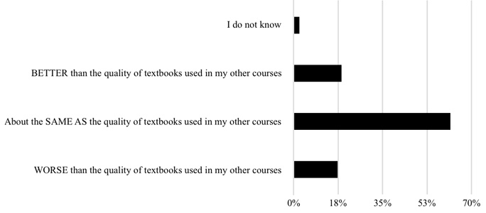 In response to the question "How would you rate the quality of the open textbook used in your course," 62% indicated the open textbook was about the same quality as the textbooks they used in their other courses, while 19% indicated the open textbook was better in quality. Among those who indicated the same quality, 62% believed open textbooks are generally the same quality as textbooks they use in other courses. Among those who indicated the better quality, 48% stated open textbooks are generally better in quality than textbooks they use in other courses. Of the 17% who believed their open textbook was worse in quality than texts used in their other courses, 32% said open textbooks are worse in quality. However, a large percent of respondents across the follow-up questions indicated they do not know if open textbooks are worse (40%), the same (22.99%), or better (41.94%) than traditional textbooks.